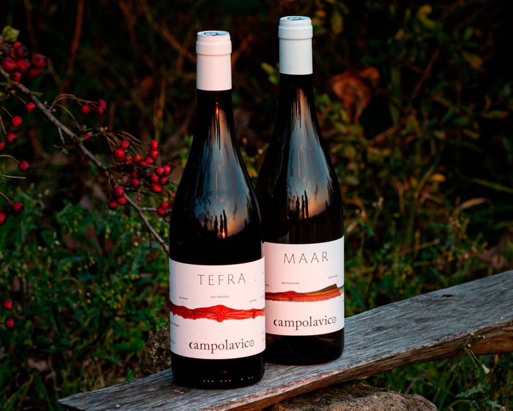 Campolavico imbottiglia due etichette i cui nomi sono coerentemente ispirati alla geologia: il bianco Maar (Malvasia Puntinata Trebbiano Verde e Bombino) si riferisce al nome dei crateri vulcanici che riempiendosi di acqua formano un lago, proprio come il Lago di Nemi; il rosso Tefra (Cesanese) fa, invece, riferimento ai materiali piroclastici prodotti durante un’eruzione. Belle anche le etichette che rappresentano la stratigrafia dei suoli dell’areale.
