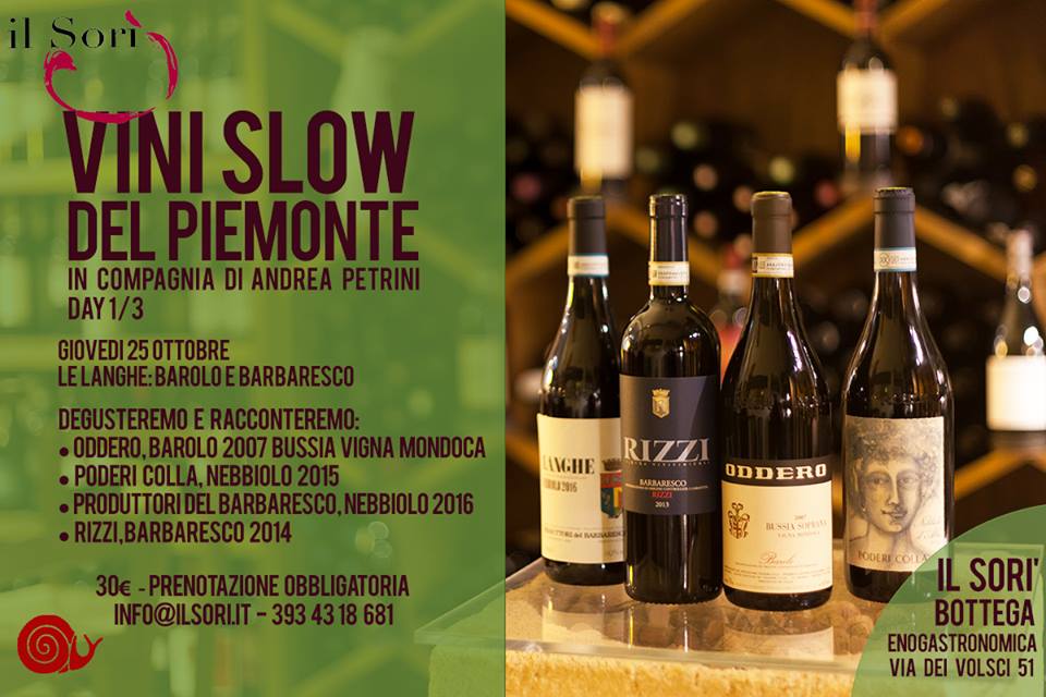 Paky Liveri, anima de Il Sorì, uno dei wine bar più slow di Roma, ed Andrea Petrini ci portano alla scoperta dei grandi vini piemontesi attraverso tre eventi dove si berranno grandi vini del territorio. La prima serata ci porterà in giro per le Langhe tra Barolo e Barbaresco.